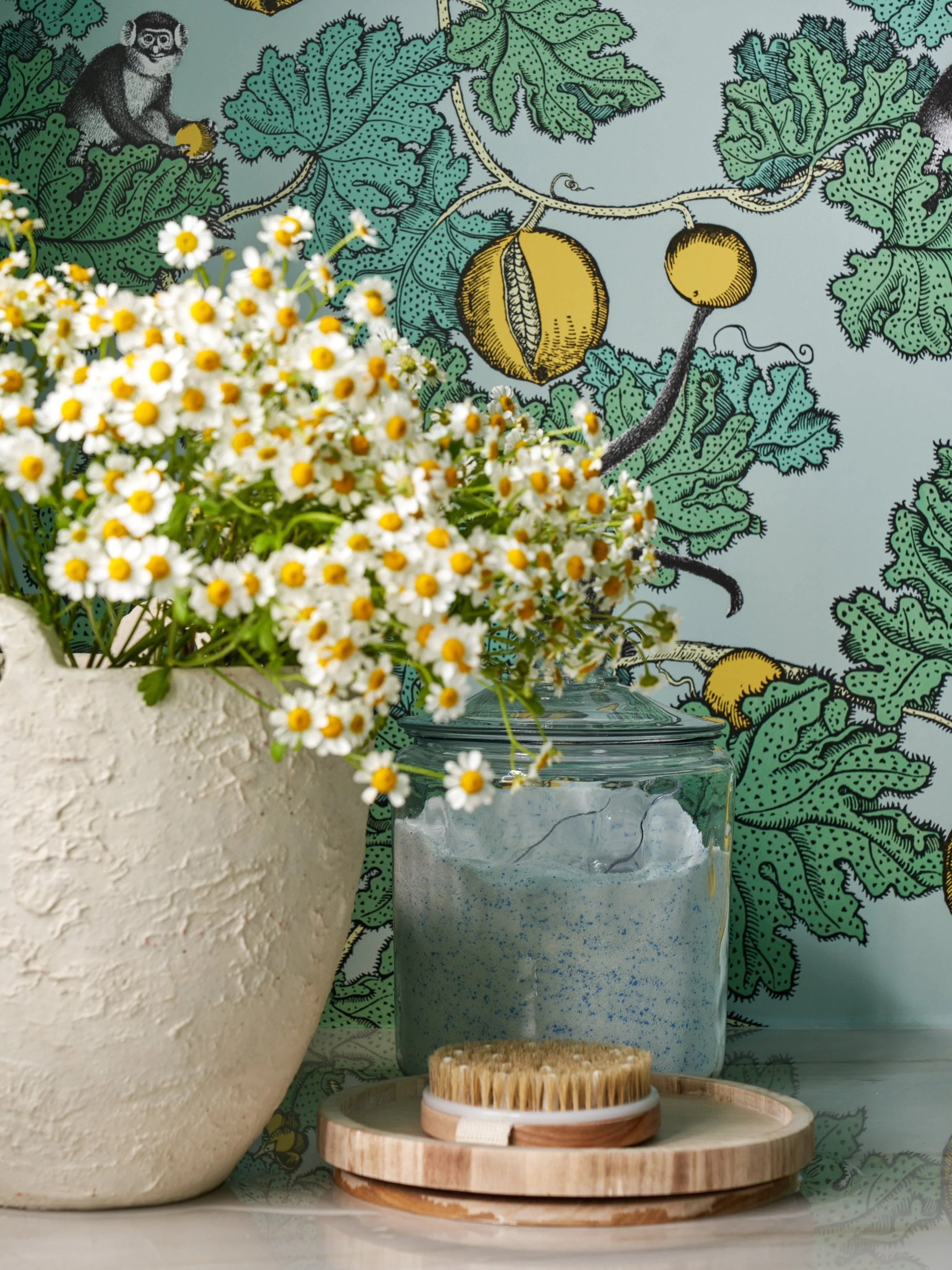 Interior design by Lark Interiors of Dallas showing a rustic white pot with dried chamomile flowers in front of colorful wallpaper