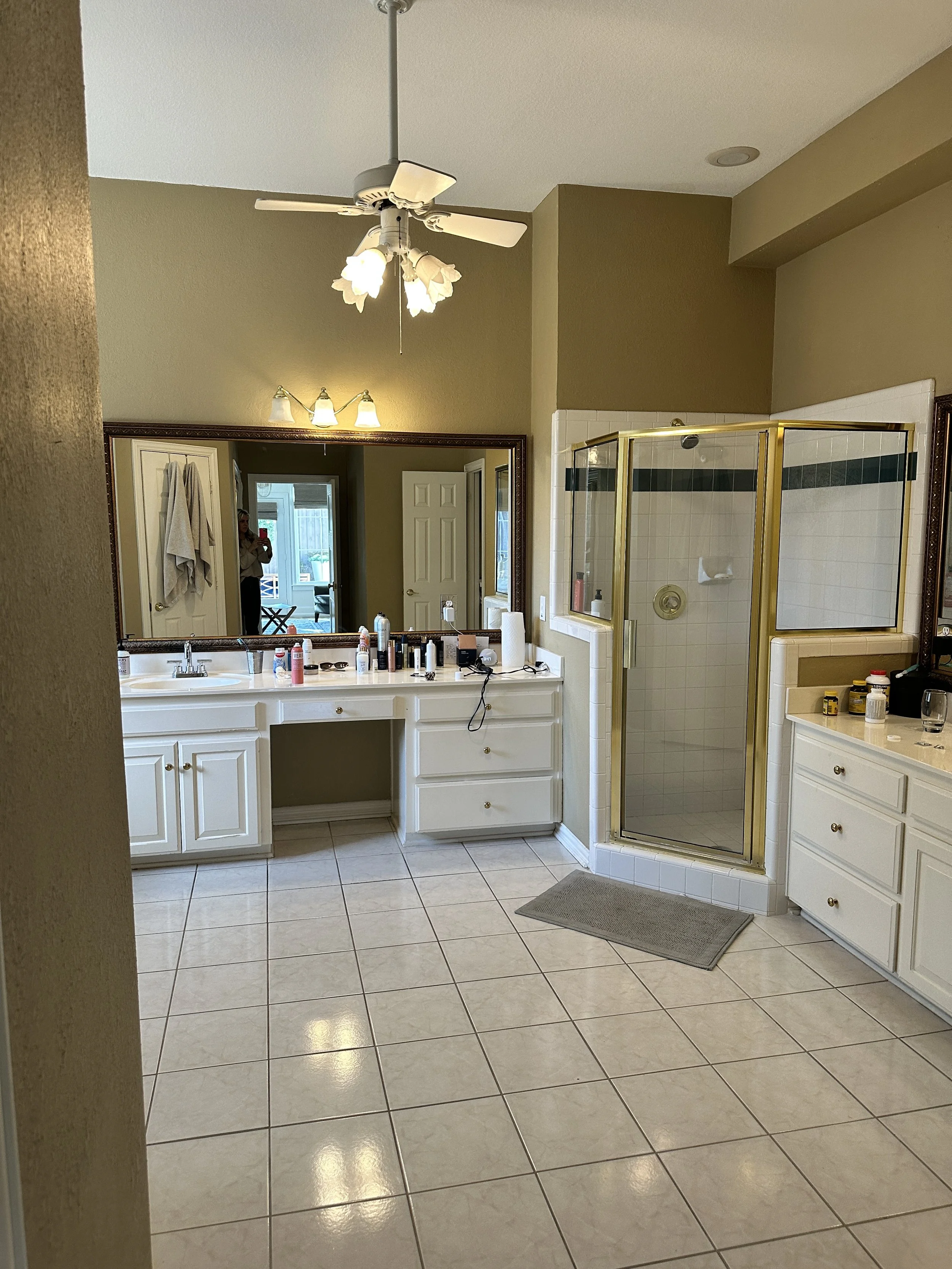 It is a 25-year-old horror show. The shower is so small that I have to use some very creative yoga skills to shave my legs. The tile is a major slipping hazard (just talk to my tailbone). And the shower water goes from freezing cold to scorching hot - with no in-between temperature. Not to mention the floorplan is terrible. I could practically roller skate in here, but only have room for about three pairs of shoes in the closet.
