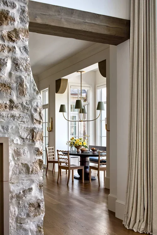 Most builder homes include basic blinds. Replace or layer with linen drapery, Roman shades, or woven wood shades. You’ll soften geometry, frame views, and improve acoustics. Plus, fabric layers add richness.